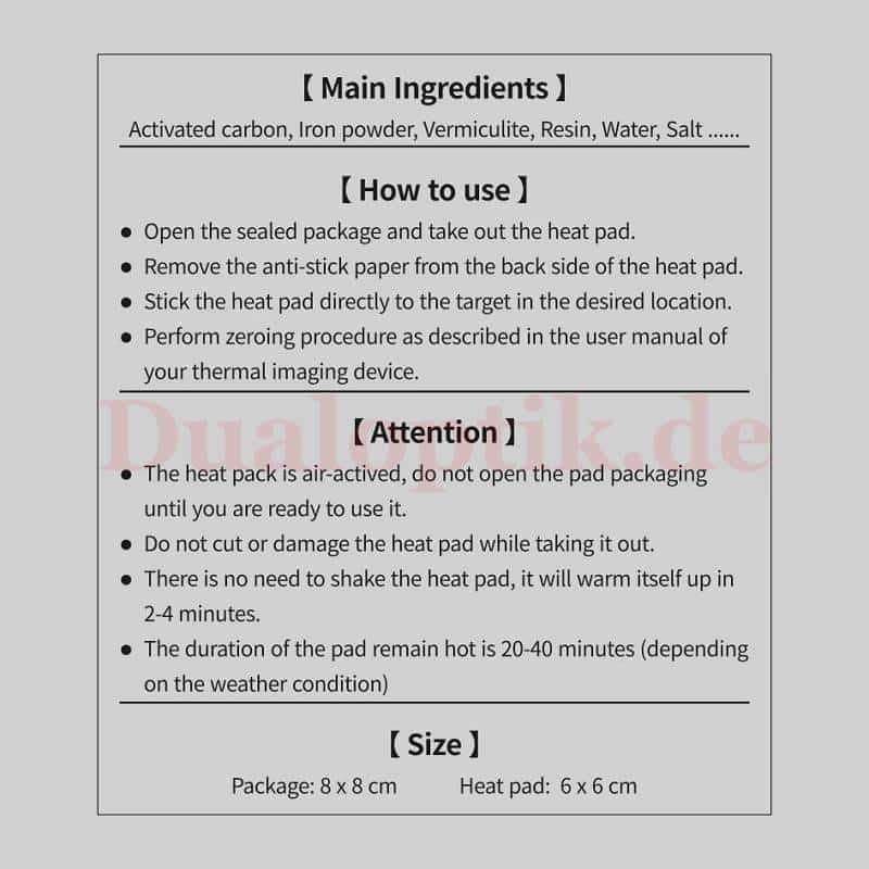 Für die Verwendung der InfiRay Wärmepads / Zielpads öffnen Sie einfach die Verpackung, und die selbstklebenden Zielscheiben reagieren durch den Kontakt mit der Luft. Nach etwa 2 bis 4 Minuten erreichen sie eine Einsatztemperatur von ca. 38 °C. Dieses Prinzip ist ähnlich wie bei Hand- oder Fußwärmern, bei denen die enthaltenen Stoffe automatisch mit Sauerstoff reagieren. Nach der Verwendung können die verbrauchten Pads bequem im Restmüll entsorgt werden.