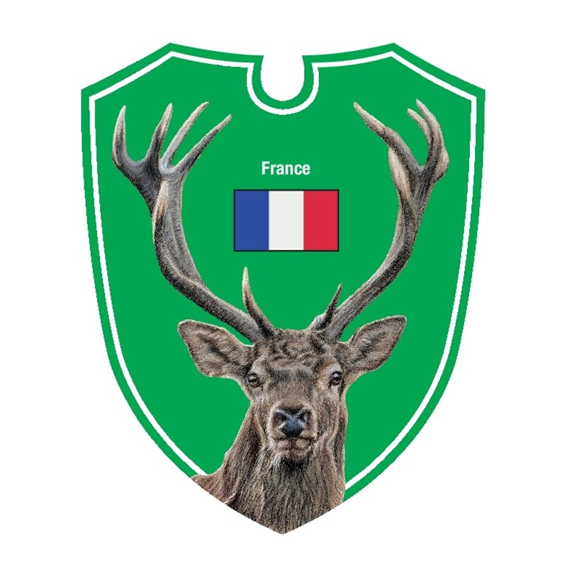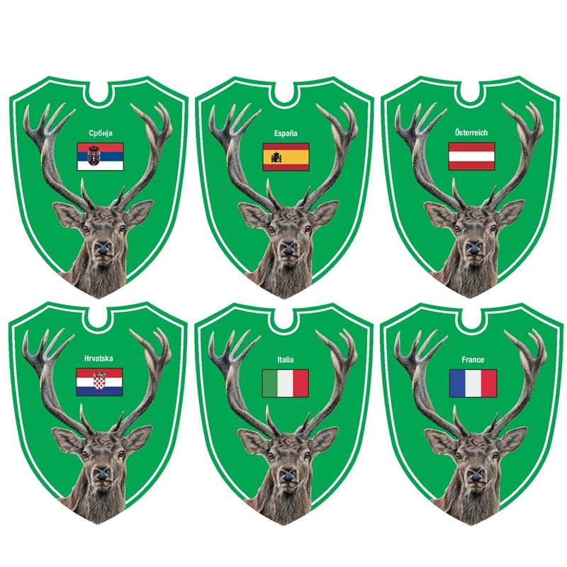 Die Fahrzeugschilder sind je mit einem stilisierten Hirsch, sowie mit der jeweiligen Landesflagge bedruckt. Die Hintergrundfarbe ist selbstverständlich jagdlich grün.