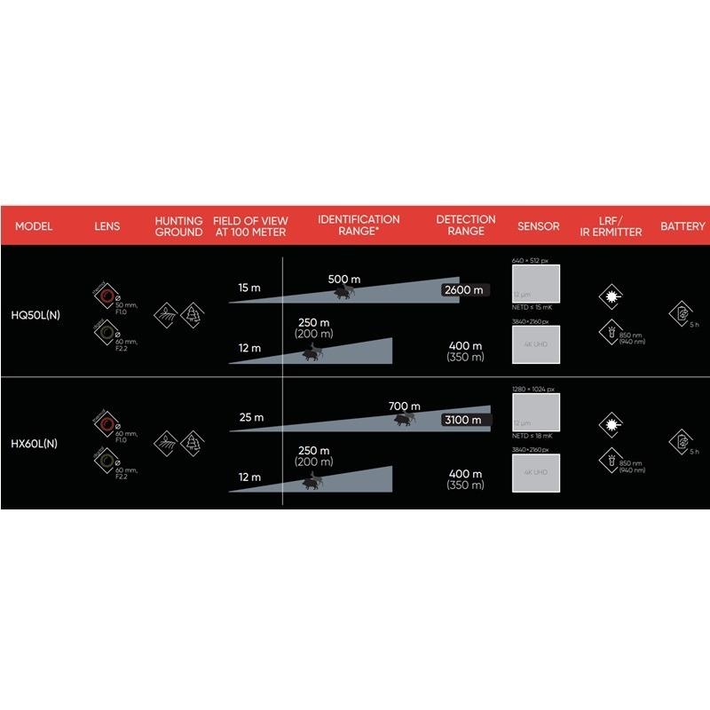 Das Fernglas verfügt zudem über einen Tages- & Nachtsichtkanal mit einem 3840 x 2160 4K CMOS Sensor, unterstützt von einem 60mm, F2.2 Fokusring. Mit einem integrierten Laser-Entfernungsmesser und einem austauschbaren Infrarot-Laser mit 850 nm oder 940 nm bietet es eine Sichtweite von 400 bzw. 350 Meter bei Nacht.